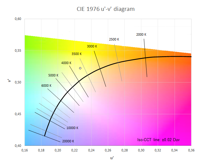 - Correlated color temperature and desviation from the black body (Duv).