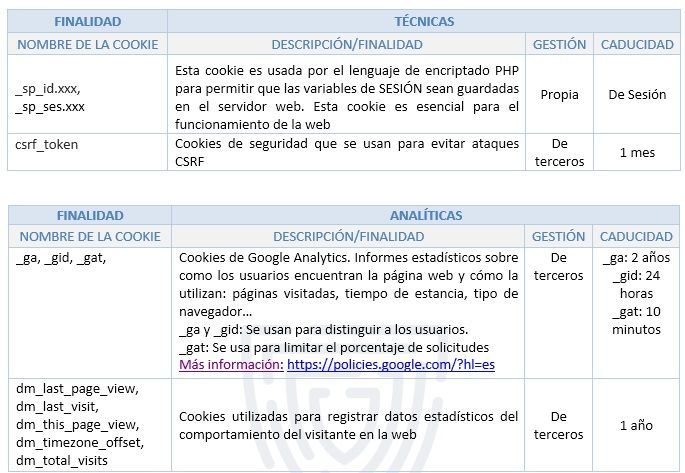 En esta web se utilizan las siguientes cookies