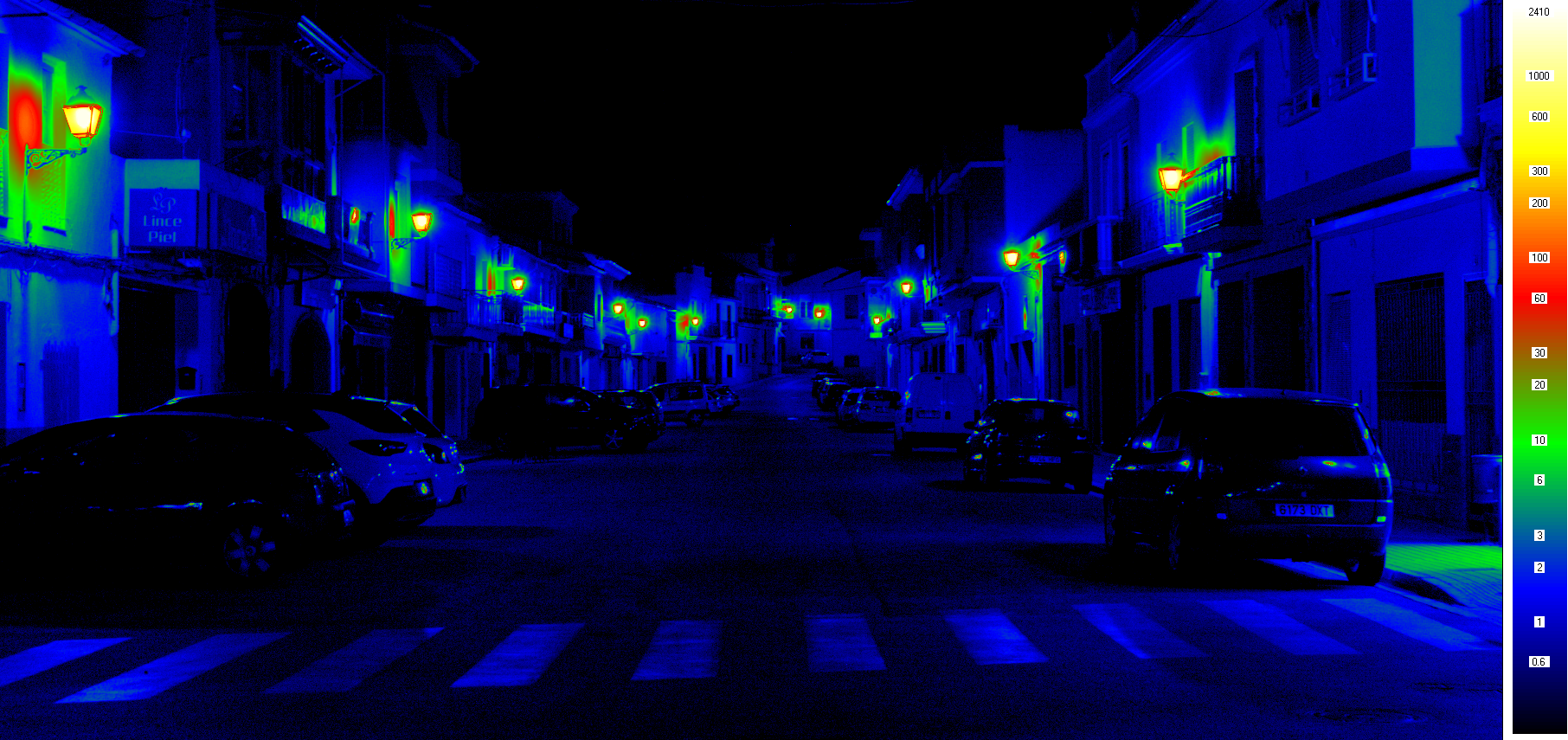 Medidas de parámetros principales que definen una instalación de alumbrado exterior como: luminancia media, uniformidad global y longitudinal, luminancia de velo, deslumbramiento perturbador (TI), índice de deslumbramiento (GR), iluminancia vertical y horizontal y relación entorno (SR).