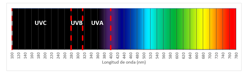 Rango espectral de la radiación ultravioleta A, B y C