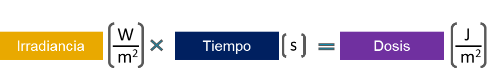 • Densidad de Energía Radiante (dosis): Es la energía total recibida en un intervalo de tiempo por unidad de área. Para un valor dado de irradiancia, varía con el tiempo. Unidad de medida: J/m².