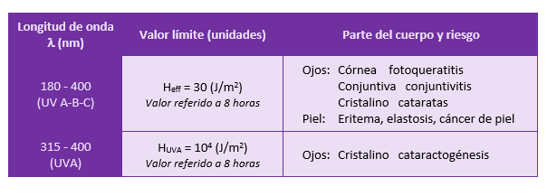 Tabla 1: Valores límites de exposición para las radiaciones ópticas incoherentes.